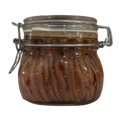 Alici sott’olio al peperoncino. Vasetto da 580 g. Filetti di alici selezionate, lavorate artigianalmente e immerse in una miscela di olio di semi di girasole, olio extravergine d'oliva e peperoncino piccante. Il sapore deciso delle alici si unisce al tocco vivace del peperoncino, per un prodotto sfizioso e saporito, perfetto per chi ama i gusti forti. Ideali per antipasti rustici, pizze, crostoni, insalate o per dare una marcia in più a primi e secondi piatti. Ingredienti: Alici (Engraulis encrasicolus), olio di semi di girasole, olio extravergine d’oliva, peperoncino. Conservare in frigorifero dopo l’apertura.