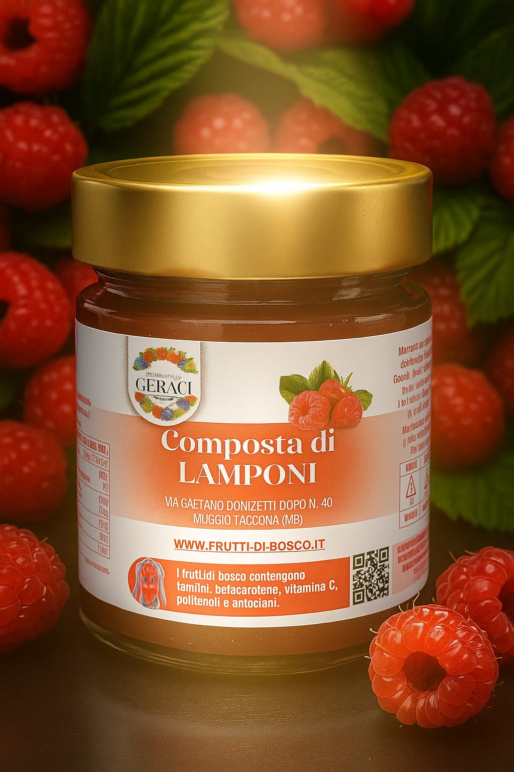 Composta di Lamponi (95% Frutta) | Lavorazione artigianale. Ingredienti: 95% Lamponi, solo un pizzico di Zucchero di Canna (Conservazione Naturale). Ottima per: gelato, yogurt, ricotta, dolci, torte, formaggi, e in abbinamenti salati (risotti, carni). Gusto intenso e genuino.