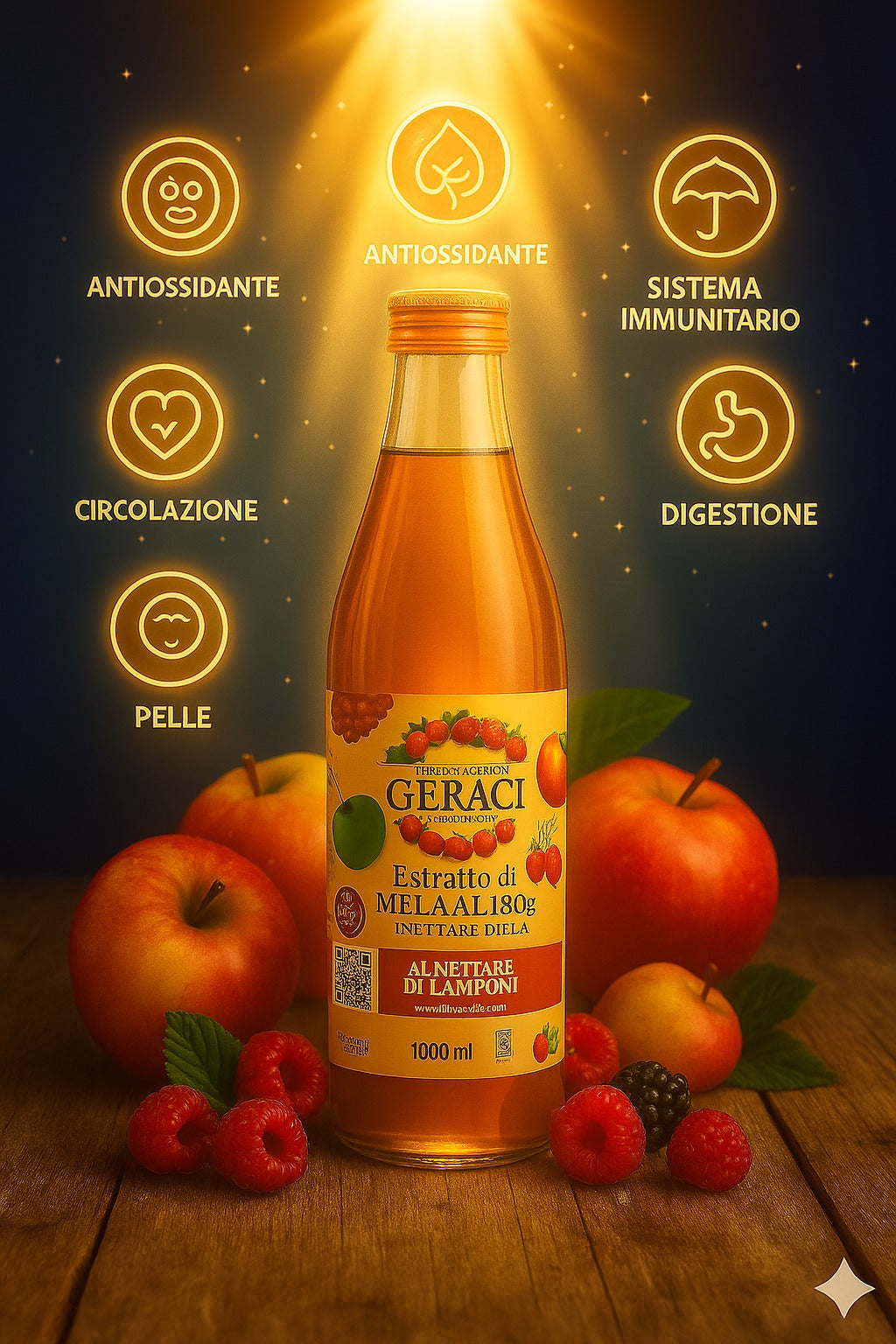 Estratto di Mela Valtellina & Lampone, Potente concentrato naturale per la depurazione del fegato.Prodotto con il 180% di matrice di mela Valtellina (1,8 kg di mele per litro) e arricchito con il 24% di Nettare di Lampone puro.La lavorazione delicata a freddo preserva le proprietà benefiche, rendendolo un elisir ideale per sostenere e coadiuvare le naturali funzioni detossificanti dell'organismo. Pura concentrazione, massimo benessere.