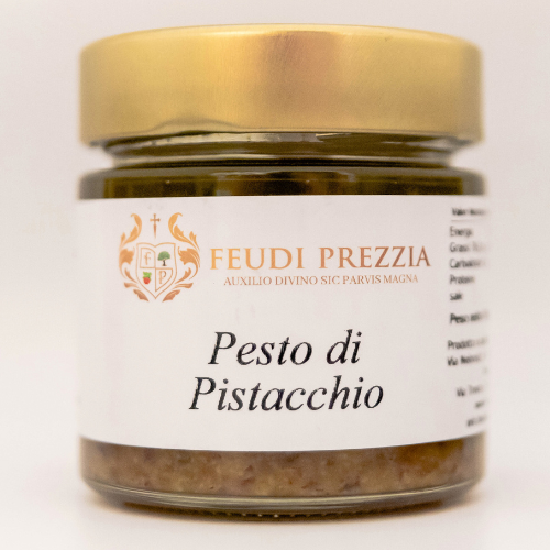 Pesto di Pistacchio. Vasetto da 190 g. Un'eccellenza della gastronomia siciliana, prodotto a Ribera con materie prime locali a km 0. Questo pesto contiene ben il 60% di pistacchio, lavorato artigianalmente per esaltarne il gusto pieno e naturale, arricchito da un tocco di noce moscata, pepe e sale, per un equilibrio perfetto tra delicatezza e intensità. La sua consistenza cremosa e il sapore avvolgente lo rendono ideale per condire pasta fresca o secca, accompagnare carni bianche e pesce, arricchire antipasti, crostini e finger food. Un prodotto semplice, genuino e di alta qualità, che porta in tavola tutto il sapore autentico del pistacchio siciliano. Ingredienti: Pistacchio (60%), olio di semi di girasole, fibra alimentare, sale, pepe, noce moscata.
